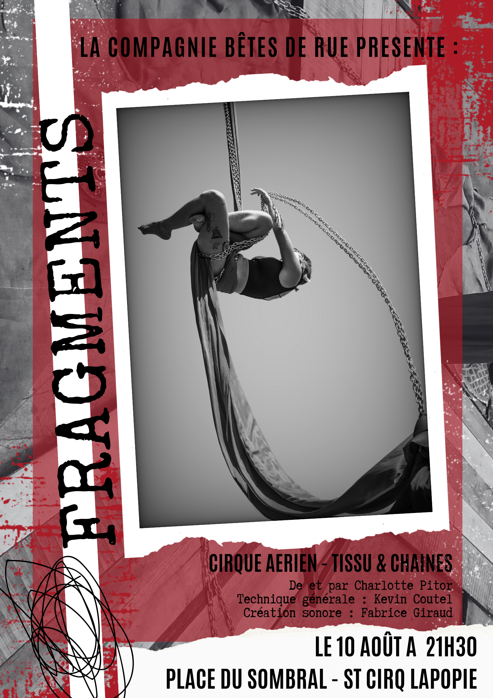 Cirque aérien - tissu & chaines "Fragments" est un solo d'aérien, où se mêlent tissu et chaînes. Un voyage, une expédition à travers les méandres de la restriction, de la contrainte, évoquant les sentiers que l'on arpente pour atteindre cet idéal d'épanouissement, de libération. C'est une performance unique, qui se joue des agrès du cirque traditionnel, explorant de nouveaux horizons avec audace et poésie. "Fragments" c'est aussi une création proposée par une jeune compagnie de cirque, membre du Collectif Zo Prod. C'est un spectacle tout public, qui durant ces deux dernières années a su émerveiller petits et grands, familles et groupe d'amis, mais aussi publics de toutes nationalités et personnes malentendantes. Par ce spectacle, nous souhaitons partager et faire découvrir au plus grand nombre notre univers singulier, aussi poétique que percutant.