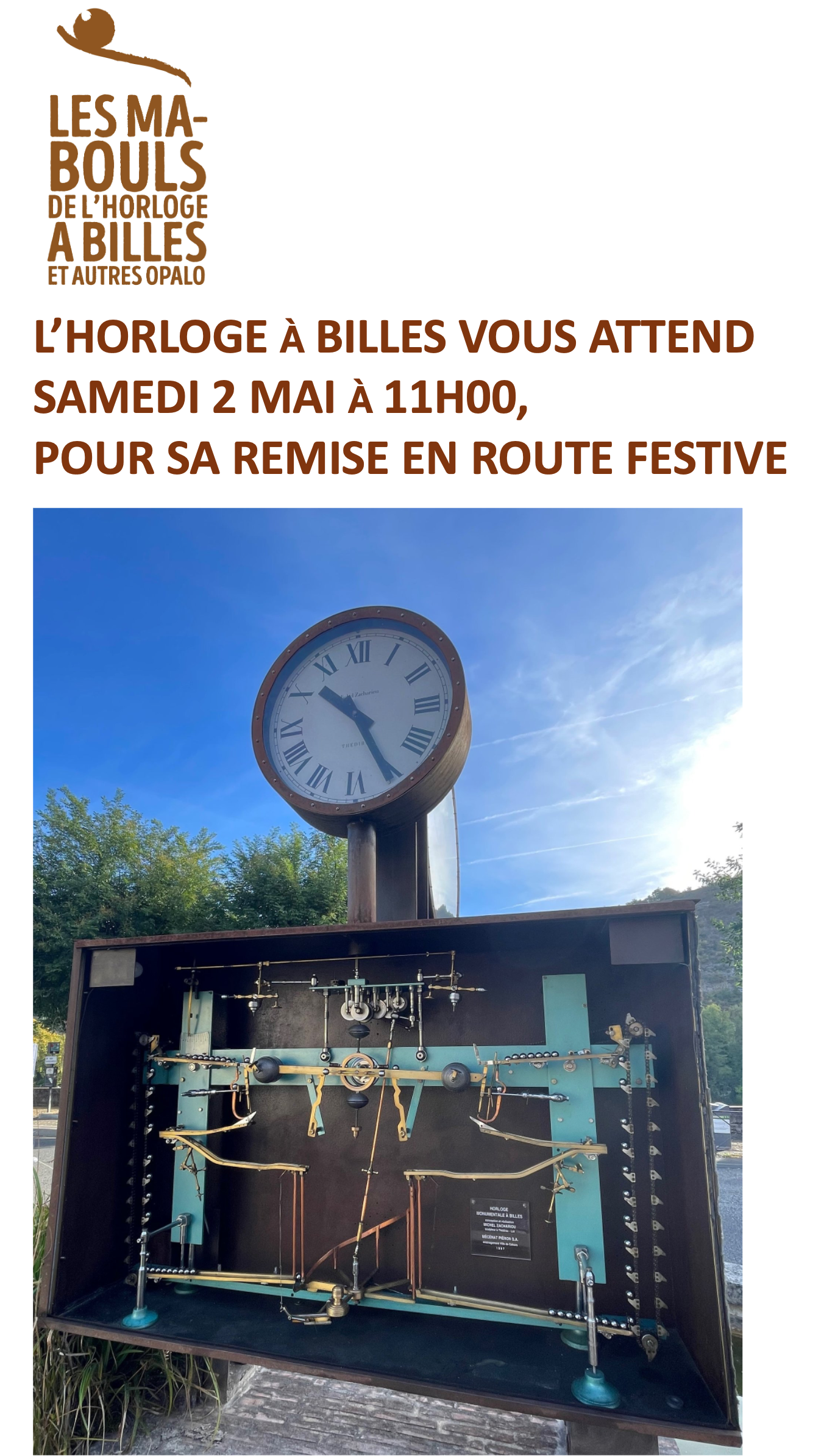 Remise en route de l'horloge à bille le 02 mai à 11h